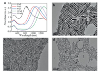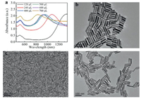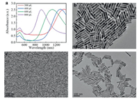 | Fig. 4. (a) Vis-NIR spectra of AuNRs prepared adding hydrochloric acid into the growth solution with different amounts of hydroquinone. (b-d) TEM images of AuNRs prepared adding hydroquinone (0.33 mol/L) with different volumes: (b) 700 μL, (c) 240 μL, (d) 120 μL. Other parameters: CTAB (0.1 mol/L, 5 mL), HAuCl4 (0.01 mol/L, 300 μL), AgNO3 (0.02 mol/L, 160 μL), HCL (1 mol/L, 45 μL), NaBH4 (0.498 mmol/L, 1 mL). Scale bar: 100 nm. | |