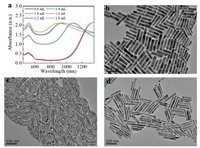 Fig. 4 shows the effect of hydroquinone concentration on AuNRs synthesis. As shown in Fig. 4, we obtained a wide range of LSPR peaks from 830 nm to 1340 nm by varying the concentrations of hydroquinone. As shown in Fig. 4a, when the concentration of hydroquinone was 6.05 mmol/L, the LSPR peak position of prepared AuNRs was the longest, 1340 nm and the corresponding aspect ratio was about 15.2. After we increased the concentration of hydroquinone to 32.46 mmol/L, the LSPR peak kept on decreasing till 830 nm and the aspect ratio was decreased to 4.5. Among them, when the concentrations of hydroquinone were increased to 11.74 mmol/L, 19.11 mmol/L, 23.55 mmol/L, and 27.86 mmol/L, LSPR peak positions were 1080 nm, 957 nm, 931 nm, 922 nm, and the aspect ratios were about 8.2, 6, 5.8, 5.6 accordingly. Figs. 4b-d showed the TEM images of AuNRs with aspect ratios of 4.5, 9, and 15.2. Compared with that AuNRs prepared by adding different amounts of ascorbic acid or other reducing agents have narrow LSPR peaks [46, 47], hydroquinone is more appropriate for preparing AuNRs with tunable aspect-ratio-dependent LSPR peaks [40].