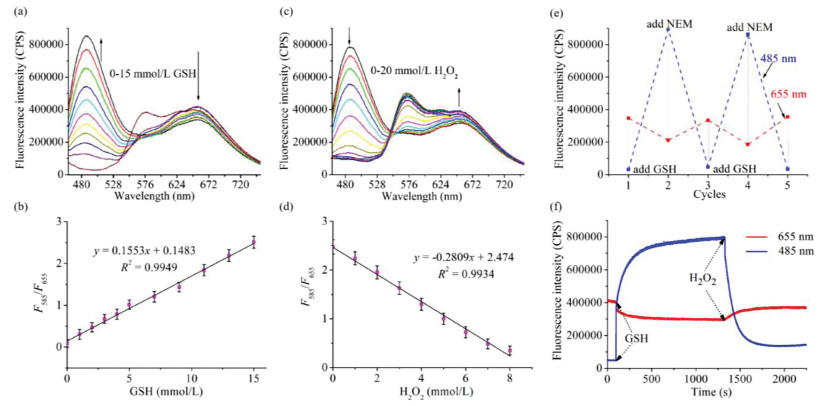 | Fig. 1. (a) Fluorescence responses of probe GR-MT (5 μmol/L) toward GSH. (b) Linear relationship between ratios (F485/F655) of the probe GR-MT and GSH concentrations. (c) Fluorescence responses of probe GR-MT (5 μmol/L) toward H2O2 after addition of 15mmol/L GSH for 20min. (d) Linear relationship between ratios (F485/F655) of the system of probe GR-MT containing GSH and H2O2 concentrations. (e) Reversibility cycles of probe GR-MT (5 μmol/L) with GSH and NEM. (f) The fluorescence intensity of the probe GR-MT changed with time after GSH (10mmol/L) or H2O2 (20mmol/L) was added. λex =445nm. | |