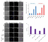 | Fig. 2. Fluorescence imaging of probe GR-MT (10 μmol/L) in RAW264.7 (a1-a4), HUVEC (b1-b4), MGC803 (c1-c4), and A549 cells (d1-d4). (e) Relative fluorescence intensities of blue (465–530 nm) and red (600–700 nm) channels of different groups. Fluorescence imaging of probe GR-MT (10 μmol/L) in MGC803 cells: (f1-f4) only probe; (g1-g4) incubation with 200 μmol/L H2O2 for 20 min after incubation with the probe for 20 min; (h1-h4) based on the second group, added 100 μmol/L H2O2 for 20 min; (i1-i4) based on the third group, added 10 mmol/L GSH for 20 min. (j) Ratios (FBlue/FRed) of the probe GR-MT in different groups. Scale bar = 20 μm. | |