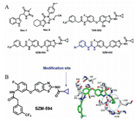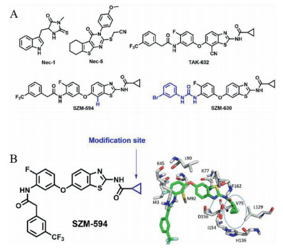 | Fig. 1. (A) Chemical structures of representative necroptosis inhibitors. (B) The predicted binding mode of SZM-594 with RIPK1 and the proposed modification site (highlighted in blue). | |