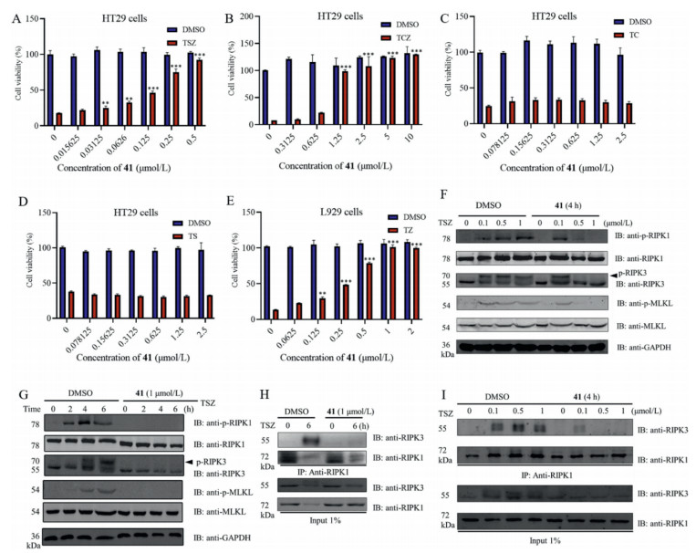 | Fig. 2. Anti-necroptosis effects of compound 41 in vitro. (A) HT-29 cells were treated with compound 41 as indicated concentrations followed by stimulation with TNF-α (20 ng/mL), Smac (10 nmol/L) and z-VAD-fmk (20 μmol/L) (TSZ) for 12 h. (B) HT-29 cells were treated with various concentrations of compound 41 as indicated by stimulation with TNF-α (20 ng/mL), cycloheximide (5 μg/mL) and z-VAD-fmk (20 μmol/L) (TCZ) for 16 h. (C) HT-29 cells were treated with various concentrations of compound 41 as indicated by stimulation with TNF-α (20 ng/mL) and cycloheximide (5 μg/mL) (TC) for 24 h. (D) HT-29 cells were treated with compound 41 as indicated concentrations followed by stimulation with TNF-α (20 ng/mL) and Smac (10 nmol/L) (TS) for 30 h. (E) L929 cells were pretreated with compound 41 as indicated concentrations followed by stimulation with TZ for 12 h. Results shown are means ± SD from three independent experiments. *P < 0.05, **P < 0.01, ***P < 0.001 versus TSZ, TCZ or TZ simulation without compound 41 treatment. (F) HT-29 cells were pretreated with compound 41 (1 μmol/L) and then stimulated with TSZ at the indicated time points. Cells were lysed and immunoblotted with the indicated antibodies. (G) HT-29 cells were pretreated with compound 41 (0, 0.1, 0.5 and 1 μmol/L) and then stimulated with TSZ for 4 h. Cells were lysed and immunoblotted with the indicated antibodies. (H) HT-29 cells were treated with DMSO or compound 41 (1 μmol/L) under the stimulation of TSZ for 6 h. (I) HT-29 cells were treated with DMSO or compound 41 with indicated concentrations under the stimulation of TSZ for 4 h. The cell lysates were immunoprecipitated with an anti-RIPK1 antibody (IP: RIPK1) and analyzed by immunoblotting with the indicated antibodies. GAPDH, glyceraldehyde-3-phosphate dehydrogenase. | |