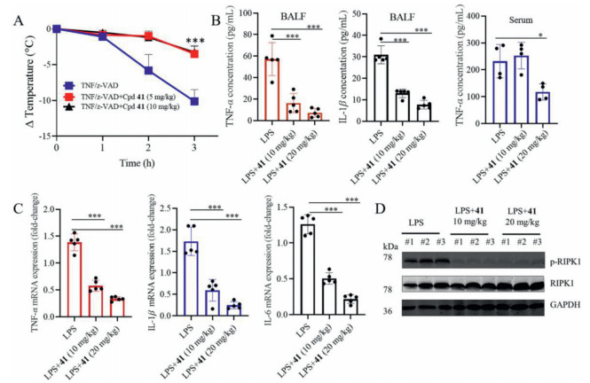 | Fig. 3. Compound 41 protected mice from TNF-α induced systemic inflammatory response syndrome (SIRS) and LPS-induced ALI in vivo. (A) Body temperature curve of C57BL/6 female mice (n = 10 per group) injected with mTNF-α (100 μg/kg) and z-VAD (1 mg/mL, 250 μL) after pretreatment with different doses of compound 41 (5 and 10 mg/kg). ***P < 0.001, treatment group vs. vehicle. (B) Levels of secreted inflammatory cytokines isolated from BALF and serum were estimated by enzyme linked immunosorbent assay (ELISA), in order to assess the effects of compound 41 on LPS-induced inflammatory response (n = 5 mice/group). *P < 0.05, ***P < 0.001 as indicated. (C) mRNA levels of TNF-α, interleukin-1β (IL-1β) and interleukin-6 (IL-6) in lung tissues from LPS-ALI and compound 41 + LPS-ALI mice were detected by reverse transcription-quantitative PCR and were normalized to actin. ***P < 0.001 as indicated. (D) Suppressive effect of compound 41 on necroptosis pathway in a mouse model of LPS-induced ALI. Western blot of lysates from mice lung tissues was used to estimate the phosphorylation level of necroptosis-associated protein (RIPK1). | |
