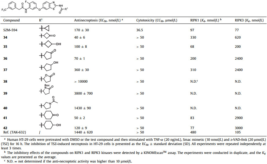 The first RIPK1 inhibitor Nec-1 was identified using a phenotypic cell screening that measured the ability to block necroptotic death [15, 30]. Thus, in this study, we applied a human colon adenocarcinoma cell (HT-29) model co-treated by a combination of TNF-α, second mitochondrial-derived activator of caspases (Smac) mimetics, and z-VAD-FMK to form the necroptosis model, termed as TSZ-induced HT-29 cell model. The inhibitory effects of the compounds on RIPK1 and RIPK3 kinases were detected by a KINOMEscanTM assay [28].