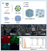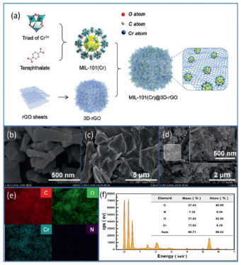 | Fig. 1. Preparation flow chart of MIL-101(Cr)@3D-rGO (a). SEM images of MIL- 101(Cr), 3D-rGO and MIL-101(Cr)@3D-rGO(1:1) (b-d); SEM element mapping of MIL-101(Cr)@3D-rGO(1:1) (e). Elemental analysis of MIL-101(Cr)@3D-rGO(1:1) (f). | |