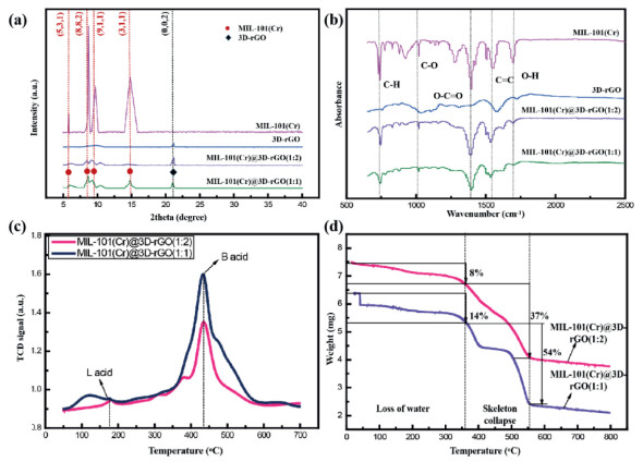 | Fig. 2. XRD patterns (a) and FTIR spectra (b) of MIL-101(Cr), 3D-rGO MIL-101(Cr)@3D-rGO(1:1) and MIL-101(Cr)@3D-rGO(1:2); NH3-TPD curve (c) of MIL-101(Cr)@3DrGO(1:1) and MIL-101(Cr)@3D-rGO(1:2); TGA curve (d) of MIL-101(Cr)@3D-rGO(1:1) and MIL-101(Cr)@3D-rGO(1:2). | |