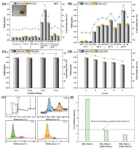 | Fig. 3. Catalytic degradation of cellulose by different catalysts (reaction conditions were 200 ℃, 1 h, 0.1 g of catalyst dosage) (a). Effect of reaction time and reaction temperature of MIL-101(Cr)@3D-rGO(1:1) on cellulose conversion products (b). Effect of the catalyst dosage on the conversion products of cellulose (reaction conditions were 200 ℃, 1 h) (c). Circulation experiment of MIL-101(Cr)@3D-rRGO(1:1) catalyst (d). XPS spectrum of the recovered MIL-101(Cr)@3D-rGO(1:1) composite catalyst after 5 cycles of experiment (e). Cr content in leachate of different catalysts (f). | |
