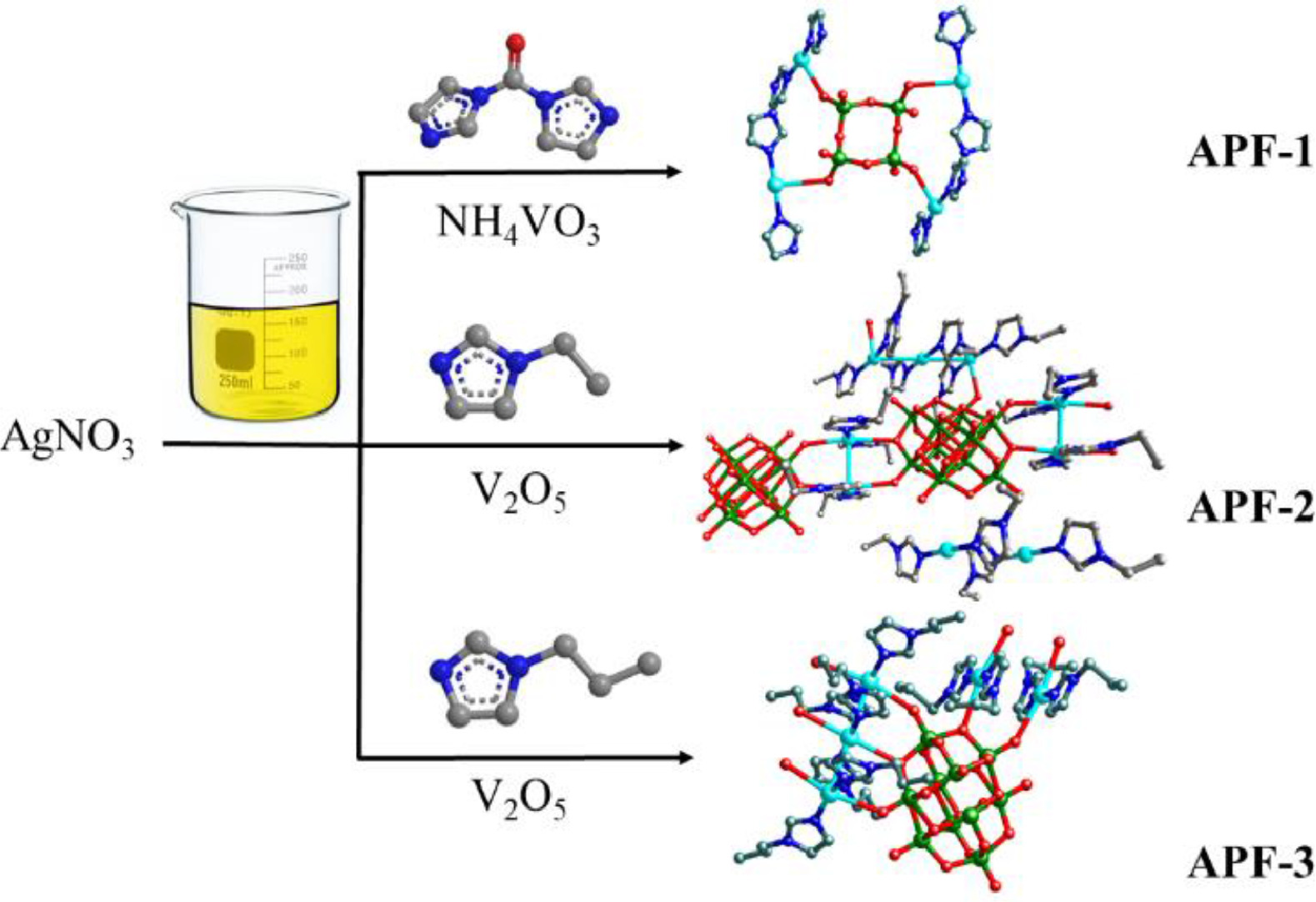 | Fig. 1. Simplified ball-and-stick representation of the syntheses of APFs 1–3. Color code: Ag, turquiose; V, green; N, blue; O, red; C, gray | |