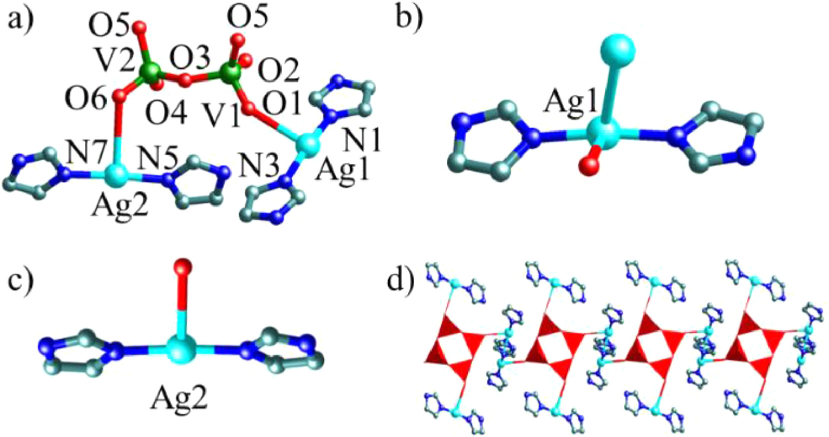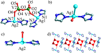 | Fig. 2. Simplified ball-and-stick and polyhedron representation of APF-1. (a) The asymmetric unit of APF-1. (b) The coordination environment of Ag1 atom. (c) The coordination environment of Ag2 atom. (d) The 1D chain structure of APF-1. Color code: Ag, turquiose; V polyhedron, red; N, blue; O, red; C, gray | |