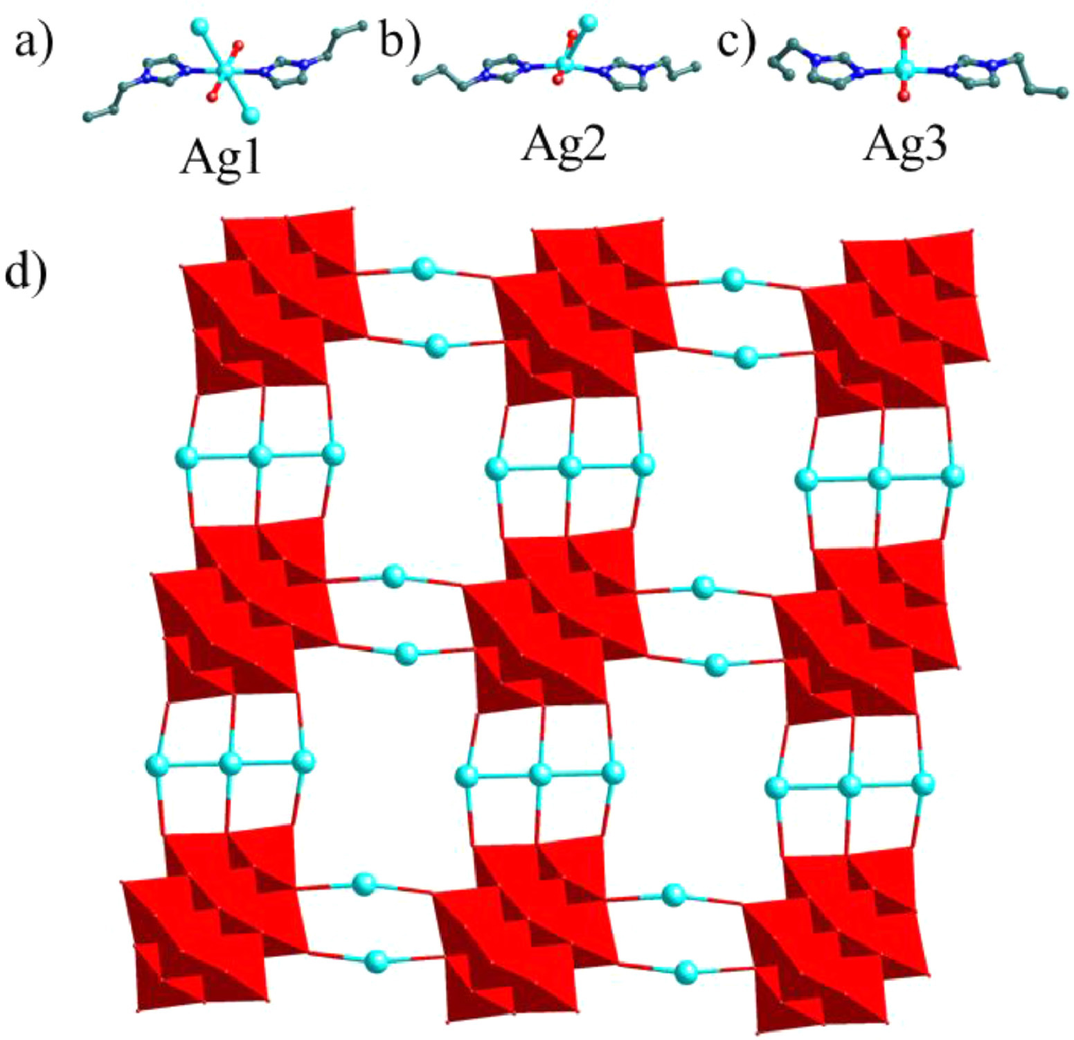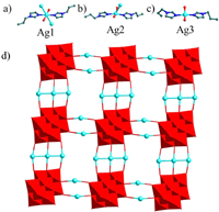 | Fig. 4. Simplified ball-and-stick and polyhedron representation of APF-3. (a) The coordination environment of Ag1 atom. (b) The coordination environment of Ag2 atom. (c) The coordination environment of Ag3 atom. (d) The 2D network structure of APF-3. Color code: Ag, turquiose; V polyhedron, red; N, blue; O, red; C, gray. The 1-pIM ligands are removed for clarity. | |