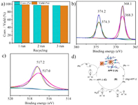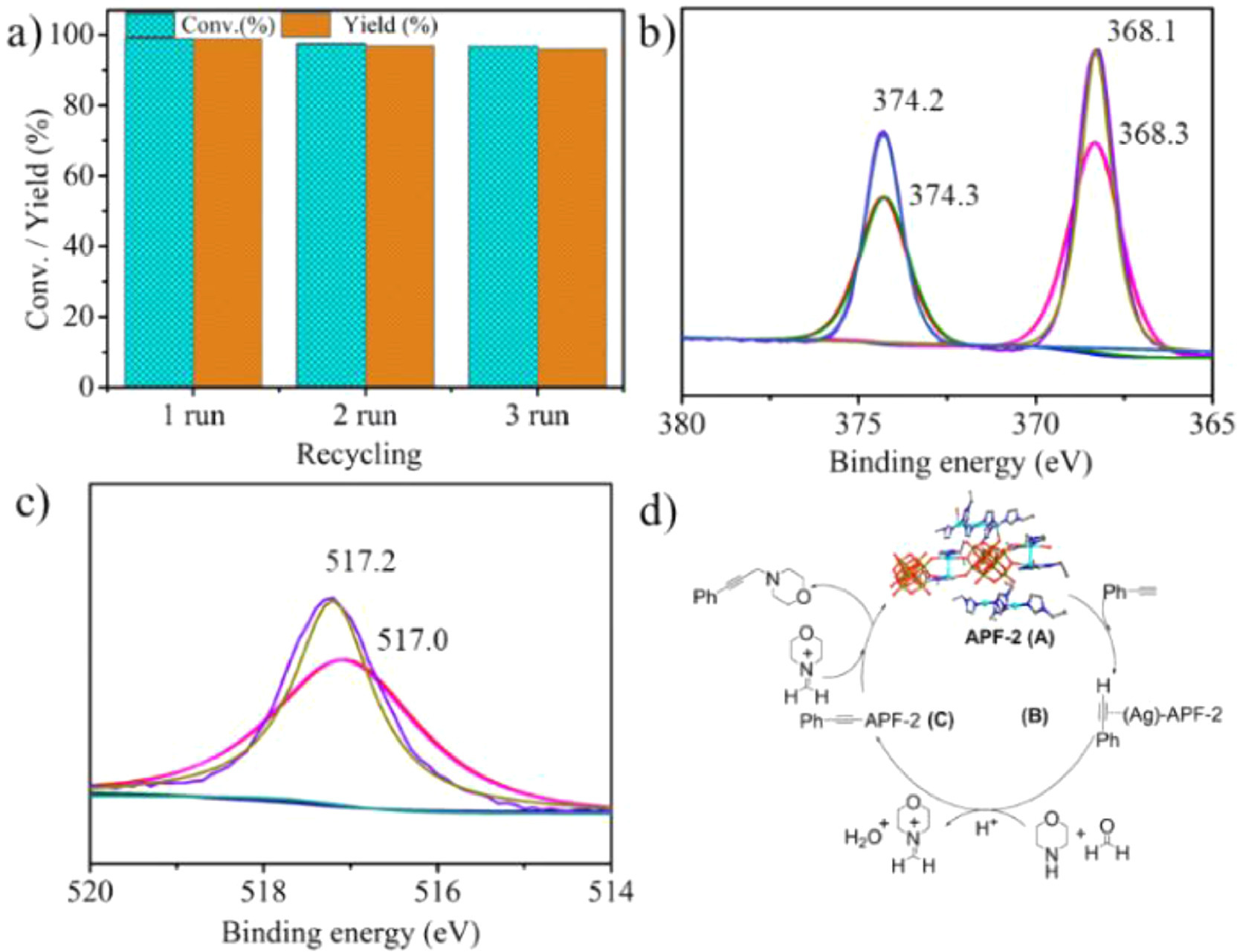 | Fig. 5. (a) The results of Mannich reaction catalyzed by APF-2 in three run experiments. (b) The XPS of Ag in APF-2 before and after three runs reaction. (c) The XPS of V in APF-2 before and after three runs reaction. (d) The proposed mechanism for Mannich reaction catalyzed by APF-2. | |