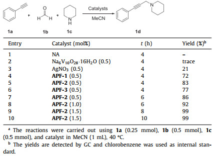 Subsequently, on the basis of determining the structure of APFs, we further investigated the catalytic effectiveness of these APFs in the construction of C-N bond via Mannich reaction. In our initial studies, phenylacetylene (1a), formaldehyde (1b) and piperidine (1c) were selected as model substrates to examine the efficiency of these APFs in the construction of C-N bond (Table 1). We conducted the three component reaction under the conditions of 1a (0.25 mmol), aqueous 1b (0.5 mmol) and 1c (0.5 mmol) in CH3CN (1 mL) in the presence of catalysts at mild conditions for 4 h