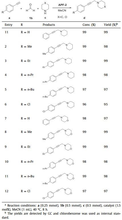 To begin, the blank experiment indicated that only trace conversion was achieved in the absence of any catalysts (Table 1, entry 1). The reactants phenylacetylene (1a), formaldehyde (1b) and piperidine (1c) were smoothly reacted with AgNO3 as the homogeneous catalyst, which gave rise to the desired product 1-(3-phenylprop-2-yn-1-yl)piperidine 1d in 21% yield (Table 1, entry 3), nevertheless, the scale potential industrial applications of the AgNO3 catalyst have been limited due to its non-reusability. Prompted by this initial observation, the model reaction was thoroughly optimized by varying different parameters, such as catalyst, the amount of catalyst, and reaction time (Table 1). The use of other catalysts like APF-1, APF-2 and APF-3 improved the product yields from 72% to 83%, respectively (Table 1, entries 4–6). APF-2 with the best performance is selected as the target catalyst for further characterization. Keeping all other parameters of entry 5 as such, the amount of catalyst and reaction time were then examined, which markedly disclosed 1.5 mol% and 8 h as optimum conditions and entry 9 as the best fit. Consequently, the best conditions for synthesis of the 1-(3-phenylprop-2-yn-1-yl)piperidine were optimized as follows: 1a (0.25 mmol), 1b (0.5 mmol), 1c (0.5 mmol) and APF-2 (1.5 mol%), MeCN (1 mL), 40 ℃, 8 h
