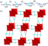 | Fig. 3. Simplified ball-and-stick and polyhedron representation of APF-2. (a) The coordination environment of Ag1 atom; (b) the coordination environment of Ag3 atom; (c) the coordination environment of Ag4 atom; (d) the coordination environment of Ag5 atom; (e) the 2D network structure of APF-2. Color code: Ag, turquiose; V polyhedron, red; N, blue; O, red; C, gray. The 1-eIM ligands are removed for clarity. | |