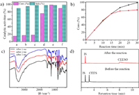 | Fig. 6. (a) Reaction conditions: CEES (0.25 mmol), H2O2 (0.3 mmol), EtOH (0.5 mL), catalysts (5 μmol), room temperature, 30 min. a: blank; b: AgNO3; c: V2O5; d: APF- 1; e: APF-2; f: APF-3. (b) Kinetics of the oxidation of CEES with APF-2 (black); APF-2 was filtered from the reaction mixture after 15 min (red). (c) The IR spectra of APF-2 before and after three runs oxidation of CEES. (d) The GC spectrum of before and after the oxidation of CEES catalyzed by APF-2. | |
