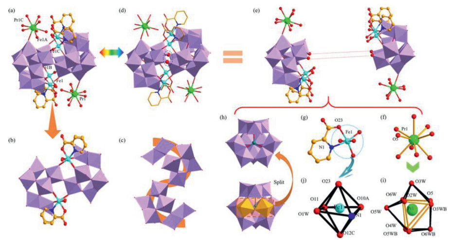 | Fig. 1. (a) The 1a hybrid anion. (b) The [Fe4(H2O)4(pca)4Ge2W20O72]8– entity. (c) The S-type [Ge2W20O72]16- cluster. (d) Double oxygen-bridging mode in 1a anion. (e) Two identical [Pr(H2O)8][Fe2(H2O)2(pca)2GeW10O36]– moieties. (f) The [Pr1(H2O)8]3+ cation. (g) The [Fe1(H2O)(pca)]2+ cation. (h) The divacant [α-GeW10O37]10- segment. (i) The coordination geometry of the [Pr1(H2O)8]3+ cation. (j) The coordination geometry of the [Fe1(H2O)(pca)]2+ cation. Color distribution: O, red; Ge, teal; Pr, bright green; Fe, turquoise; N, blue; C, light orange; {WO6}, lavender. Symmetrical codes: A -x, -y, 1-z; B x, -y, z; C -x, y, 1-z. | |