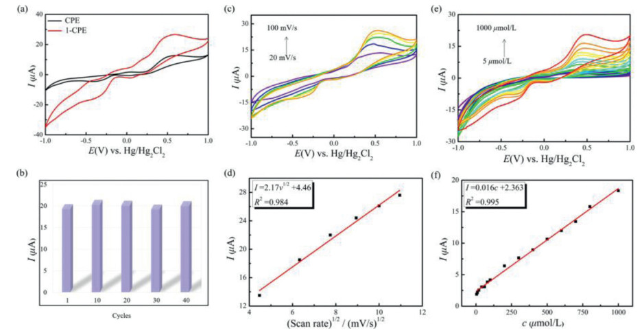 | Fig. 3. (a) CV curves of CPE and 1-CPE in the PBS (pH 6.50) containing 1.00 mmol/L NPP. (b) Comparison of current peak values at different scan cycles. (c) CV curves of 1-CPE at different scan rate (20–100 mV/s) in the PBS (pH 6.50) containing 1.00 mmol/L NPP. (d) The linear equation between the peak current and the square root of scan rate. (e) CV curves of 1-CPE in the PBS (pH 6.50) containing different concentrations of NPP (5–1000 μmol/L). (f) The linear equation between the peak current and the concentration of NPP. | |