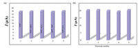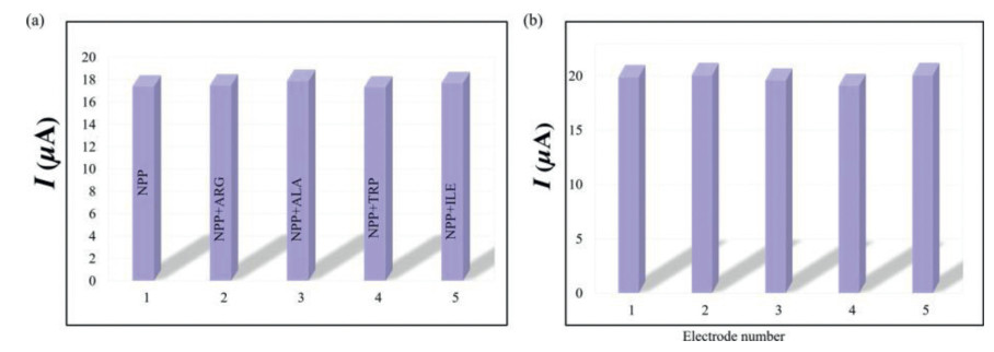 | Fig. 4. (a) Comparison of the NPP peak current intensity measured in the presence of 1.00 mmol/L of different interferences (Alg, Ala, Trp, Ile). (b) Comparison of the peak current of the CV curve measured by five independent 1-CPE ECSs in the PBS (pH 6.50) containing 1.00 mmol/L NPP. | |