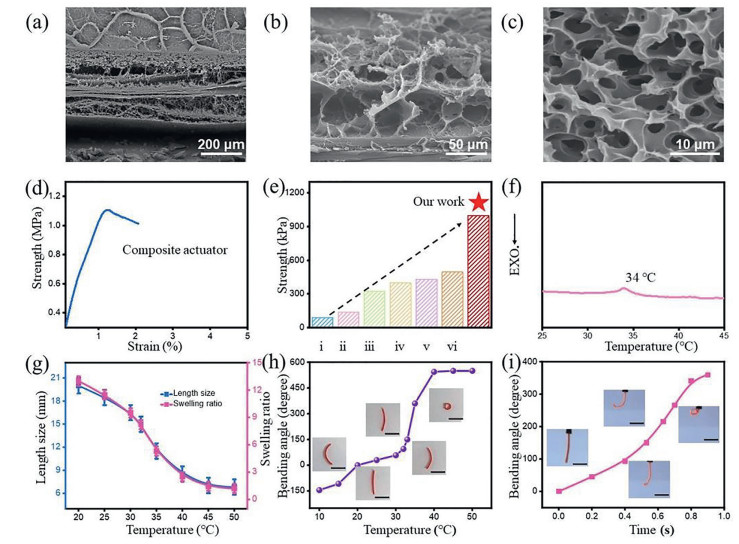 | Fig. 1. Structure and basic performance of wood-PNIPAM composite hydrogel actuator. (a) Cross-sectional SEM image of the wood-PNIPAM composite hydrogel. (b) SEM image of wood channels in wood-PNIPAM composite hydrogel. (c) Magnification SEM image of pure PNIPAM hydrogel. (d) Stress-strain curve of wood-PNIPAM composite hydrogel actuator. (e) Comparison of mechanical strength of previously reported composite PNIPAM hydrogels: (i) Al-alginate/PNIPAM [36], (ii) Clay-PNIPAM hydrogel [37], (iii) PNIPAM/clay/CMCTs/GP NC DN [38], (iv) GO-clay-PNIPAM [39], (v) NCDN [40], (vi) PPU@PS-co-PNIPAM [41]. (f) DSC curve of PNIPAM hydrogel. (g) The equilibrium swelling rate and length size of PNIPAM hydrogel at different temperatures. (h) The bending equilibrium angle of the wood-PNIPAM composite hydrogel actuator at different temperatures. (i) Curve of bending angle over time of the wood-PNIPAM composite hydrogel actuator in 40 ℃ warm water. Scare bars in (h, i): 5 mm. | |