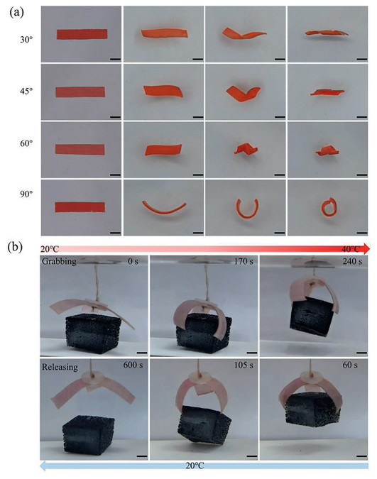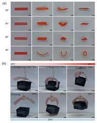 | Fig. 2. The actuation deformations and application of the wood-PNIPAM composite hydrogel actuator. (a) Complex deformations of the wood-PNIPAM composite hydrogel actuator. (b) Micro gripper grabs and releases heavy object (scale bars: 3 mm). | |