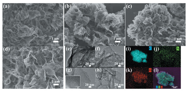 | Fig. 2. SEM images of MPK0 (a), MPK1 (b), MPK2 (c) and MPK3 (d). TEM images of MPK0 (e), MPK1 (f), MPK2 (g, inset is the high-resolution TEM image) and MPK3 (h). EDS elemental mappings of MPK2: C (i), N (j), O (k) and overlapped elemental mapping images of C, N and O in MPK2 (l). | |