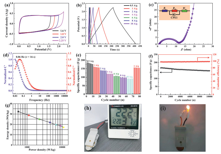 | Fig. 4. The electrochemical performances of MPK2-based device: CV curves at different voltage windows at 10 mV/s (a), GCD curves (b), Nyquist plots (c), the normalized real and imaginary part capacitance (d), cyclic stability at different current densities (e), cycling performance at 1 A/g (f), Ragone plots (g) and photograph of thermohygrograph and LED powered by the MPK2//MPK2 supercapacitors (h, i). | |
