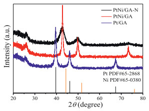 | Fig. 1. XRD patterns of PtNi/GA-N, PtNi/GA and Pt/GA catalysts. | |