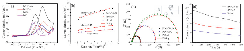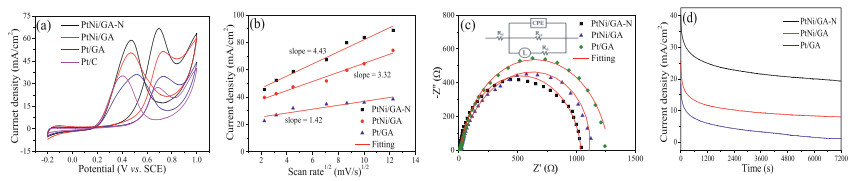 | Fig. 5. (a) Cyclic voltammetry curves of PtNi/GA-N, PtNi/GA Pt/GA and commercial Pt/C (20 wt%) catalysts in 0.5 mol/L H2SO4/1 mol/L CH3OH solution at a scan rate of 50 mV/s. (b) The plot of anodic peak current density vs. the square root of scan rate. (c) Nyquist plots of PtNi/GA-N, PtNi/GA and Pt/GA catalysts (inset for equivalent circuit). (d) Chronoamperometry curves of PtNi/GA-N, PtNi/GA and Pt/GA catalysts in 0.5 mol/L H2SO4/1 mol/L CH3OH solution. | |