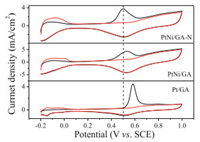 | Fig. 4. CO stripping voltammograms of PtNi/GA-N, PtNi/GA and Pt/GA catalysts in 0.5 mol/L H2SO4 solutions at a scan rate of 20 mV/s. | |