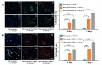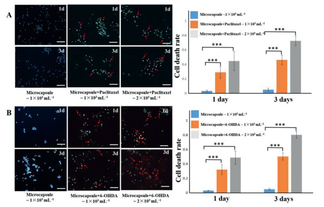 | Fig. 4. (A) Results of PC12 cells after paclitaxel-loaded PEGDA microcapsules treatment for 1 day (1d) and 3 days (3d). (B) Results of PC12 cells after 6-OHDA-loaded PEGDA microcapsules treatment for 1d and 3d. Blue: DAPI; Red: dead cells in PI staining; ***P < 0.001; n = 9; Scale bar: 100 μm. | |