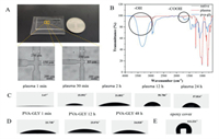 | Fig. 1. (A) Photograph image of the PDMS microchip and micrograph of two convergent channels; Scale bar: 200 μm. (B) FTIR spectrum of PDMS after untreated, plasma treatment and PVA-GLY modified liquid treatment. (C) The change of contact angle between PDMS surface and water after plasma treatment with time. (D) The change of contact angle between PDMS surface and water after PVA-GLY modified liquid treatment with time. (E) The contact angle between the part covered by epoxy glue and water. | |