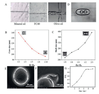 | Fig. 3. (A) Optical image of double emulsion formed by different oil phases as the outermost continuous phase. (B) Diagram of the relationship between core size and flow rate (QI/QM) for the first channel converges to form core droplet. QI was 1 μL/min. (C) Diagram of the relationship between core size and flow rate (QM/QO) for the second channel converges to form a double emulsion. QI was 1 μL/min, QM was 3 μL/min. (D) Image of two cores microcapsules. (E) SEM image of the complete shape of PEGDA microcapsules; Scale bar 50 μm. (F) SEM image of the microcapsule shell: Scale bar 100 μm. (G) The curve of drug release of coumarin 6. Ii was fluorescence intensity of coumarin 6 released from microcapsules under different measuring time. Ib was fluorescence intensity of coumarin 6 released from microcapsules at balance. | |