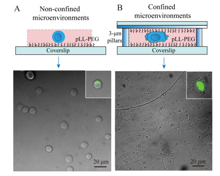 | Fig. 3. HeLa cells in non-confined (A) or confined (B) microenvironments on low adhesive substrates. Cells were cultured in PBS buffer solution (10 mmol/L, pH 7.4). The fluorescence imaging of nucleus in confined or non-confined cells was shown in the inset. | |