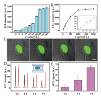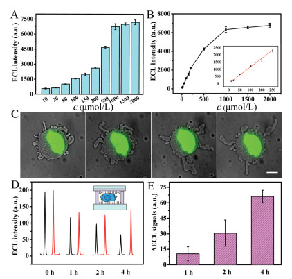 For exploring metabolic differences in highly confined microenvironments, HeLa cells were cultured in phosphate buffered saline (PBS) solution for in-situ monitoring of secreted lactate on the ECL platform. The ECL responses were measured at different time intervals in the presence and absence of lactate oxidase. As exhibited in Fig. 3C, confined cells showed contractive blebs around the cell edge along with time. The background in microenvironments (Fig. 3D) may result from varied metabolism, while the signal differences in Fig. 3E resulted from cell-secreted lactate gradually increased along with time, and the concentration reached ~5 µmol/L at 4 h. Simultaneously, signal differences of ECL responses in non-confined microenvironment were hard to be monitored, which indicating stronger metabolisms of anaerobic respiration under confinement.