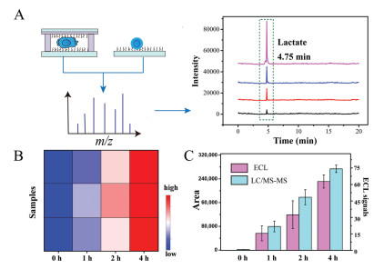 For verifying the fluctuation of lactate in confined microenvironments, as shown in Fig. 4A, samples in different time intervals were collected through centrifugation for LC-MS/MS analysis. The lactate in samples was well detected in LC-MS/MS methods, and the heat map of samples in different time intervals (Fig. 4B) was intuitively exhibited for the differential expression. The secreted lactate gradually increased along with confined time (Fig. 4C), which was consistent with in-situ monitored results on the ECL platform. The above results further demonstrated the accuracy of the ECL platform.