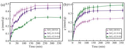 The adsorption kinetics for Cu(Ⅱ) and Ag(Ⅰ) are presented in Fig. 1. The adsorption proceeds fast in the first 70 min. Take SiO2-G2.0-SA as example, the adsorption amount are 0.18 and 0.32 mmol/g for Cu(Ⅱ) and Ag(Ⅰ) at 70 min, which accounts for 57.39% and 81.73% of the equilibrium adsorption capacity. And then, the adsorption proceeds progressively until reaching equilibrium at 180 and 150 min for Cu(Ⅱ) and Ag(Ⅰ). The equilibrium adsorption capacity are 0.48 and 0.39 mmol/g for Cu(Ⅱ) and Ag(Ⅰ), respectively. The fast adsorption at the initial is attributed to the presence of large number of available active binding sites and high concentration of metal ions, which facilitates the contact and interaction between them [33]. With the contact time extended, the adsorption rate gradually turns slow until reach equilibrium after a quick occupation of available binding sites by Cu(Ⅱ) and Ag(Ⅰ).