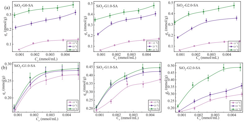 Fig. 2 shows the adsorption isotherms of the two ions at different temperatures. The adsorption was promoted by increasing temperature and initial metal ion concentration. Take SiO2-G2.0-SA for example, the adsorption amount for Cu(Ⅱ) increases from 0.32 to 0.48 mmol/g when the initial Cu(Ⅱ) concentration increases from 0.001 to 0.005 mol/L under 35 ℃. The promotion of the adsorption by raising concentration is ascribed to the increasing driving force under high concentration that promotes the transfer of metal ion to the adsorbent [36]. As for the influence of temperature, the adsorption amount for Cu(Ⅱ) is increased from 0.06 mmol/g to 0.32 mmol/g with the temperature varies from 15 ℃ to 35 ℃ under the concentration of 0.001 mol/L. The result suggests that the adsorption was conducted endothermically [37].