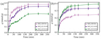 | Fig. 1. The adsorption kinetic curves of Cu(Ⅱ) (a) and Ag(Ⅰ) (b) (T = 25 ℃, pH 6, madsorbents = 20 mg, CCu(Ⅱ) = 0.005 mol/L, CAg(Ⅰ) = 0.005 mol/L). | |