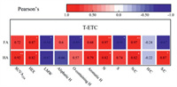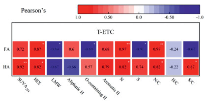 | Fig. 4. Correlation between Chemical structures of HS and the total-Fe(Ⅱ) generating the compost derived HA and FA mediating hematite bioreduction (T-ETC). The correlation coefficient (R2) between redox capacity and inherent structures was indicated by color and numbers. Significance (P) of the correlations (*) and (**) were indicated at the level of 0.05 and 0.01, respectively. | |