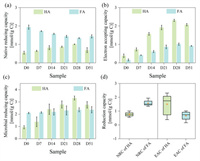 | Fig. 1. Native reducing capacity (a), electron accepting capacity (b) and microbial reducing capacity (c) of the compost-derived HA and FA and (d) their distribution of the native reducing capacity (NRC) and electron accepting capacity (EAC). ★ Represents the average value. | |