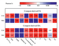 | Fig. 3. Correlation between redox capacity of HS and its inherent structures. The correlation coefficient (R2) between redox capacity and inherent structures was indicated by color and numbers. Significance (P) of the correlations (*) and (**) were indicated at the level of 0.05 and 0.01, respectively. | |