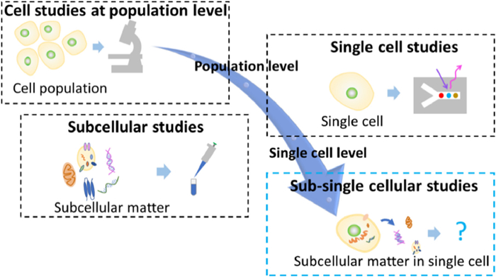It is believed that complete elucidation of the nature of the heterogeneity of cells depends on the development of cell studies at the sub-single-cell level, which is defined and referred to here as sub-single cellular studies. Sub-single cellular studies are considered as an evolution of the field of cell studies. Sub-single cellular studies comprise a variety of investigations on subcellular matter in a single cell, aiming to understand the details and heterogeneity of individual cells in terms of subcellular matters or even at the single component/vesicle/molecule level. In contrast to single-cell studies, sub-single cellular studies primarily focus on subcellular matters, including intracellular, intercellular, and extracellular matters. In addition, unlike conventional subcellular studies that concentrate on subcellular matters from cell populations, sub-single cellular studies focus on subcellular matters from individual cells and aim to investigate single cells at the molecular level or even at the single molecule level. As they provide extensive information regarding individual cells, these subcellular matters would be promising biomarkers for future biological analysis, offering a new path to elucidate the heterogeneity of cells and understand biology in a much deeper and more precise manner. However, exploration at the sub-single-cell level is still rare and remains a significant challenge because of the lack of proper strategies and tools.