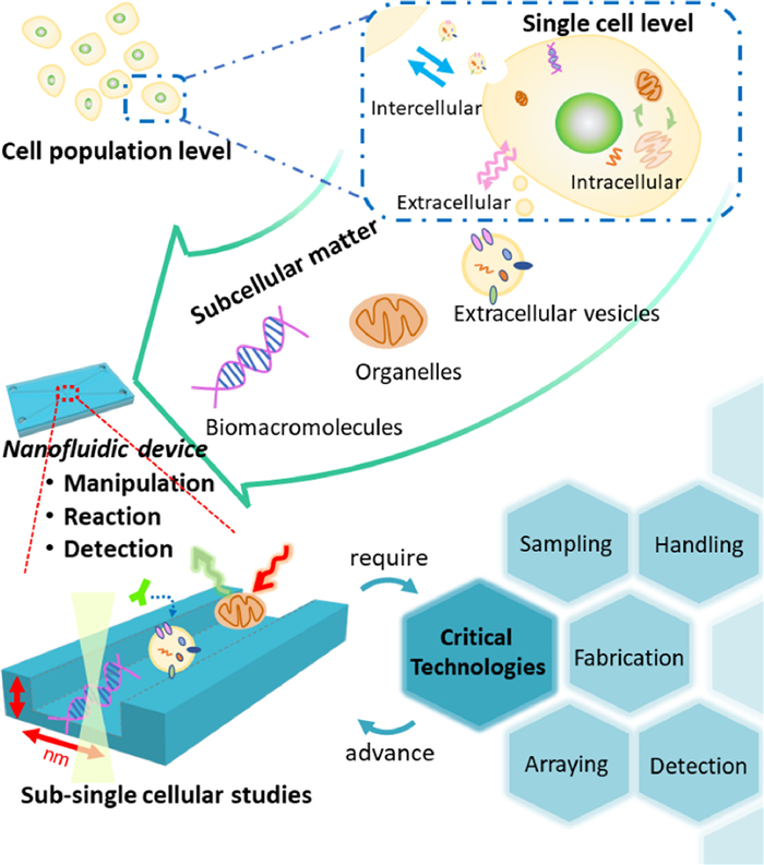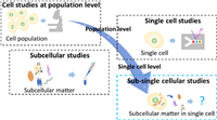 The evolution of cell studies and their related strategies are shown in Fig. 1. In the past, cell studies, attributed to optical microscopic technologies, enabled the classification of cells and the understanding of cellular structures and behaviors at the population level. Hence, it is possible to study the morphology and functional differences of different cell types at the microscale level [7-10]. With the development of chemical, biological, and analytical technologies, the contents of cells, which are the so-called "subcellular matter, " could be investigated using strategies such as enzyme-linked immunosorbent assay and western blotting analysis. Subcellular matter, including many types of biomolecules (such as proteins and nucleic acids), subcellular components (such as membranes, cytoskeleton, genetic materials and organelles), and vesicles (within or outside a cell), are the basic materials and information carriers of cell structures, functions, processes, and activities. As a development of cell studies at the population level, subcellular studies have permitted the investigation of the contents of cells and the understanding of cells at a much smaller scale than before, revealing the content composition of different cells at the population level [11-14]. However, in those traditional cellular and subcellular studies, their investigation targets are a large group of cells. They are usually limited to obtaining homogeneous results, which means it is difficult to recognize the difference between individual cells. To advance, single-cell studies have been highly developed, permitting the analysis of cells one by one owing to the advances in single-cell manipulation and detection technologies such as microfluidics, flow cytometry, fluorescence imaging, and label-free detection [15, 16]. In this way, the results obtained are not the average, continuous signals at the cell population level but discrete signals for the individual objects. Thus, information on the heterogeneity of individual cells in terms of a whole-cell can be obtained [17-20]. Nevertheless, the information obtained from current studies is insufficient to fully understand and elucidate the heterogeneity of individual cells in terms of subcellular matter. In other words, the heterogeneity inside a single cell is still largely unclear.
