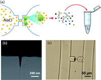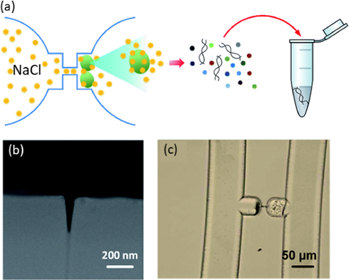 | Fig. 3. Single cell-level sampling technology using nanofluidic device. (a) Schematic of cell trapping, lysis and matter extraction using nanofluidic device. (b) SEM image of the FIB-milled nanochannel. (c) Optical image of the trapped cells after the lysis. Reproduced with permission [70]. Copyright 2015, the Royal Society of Chemistry. | |