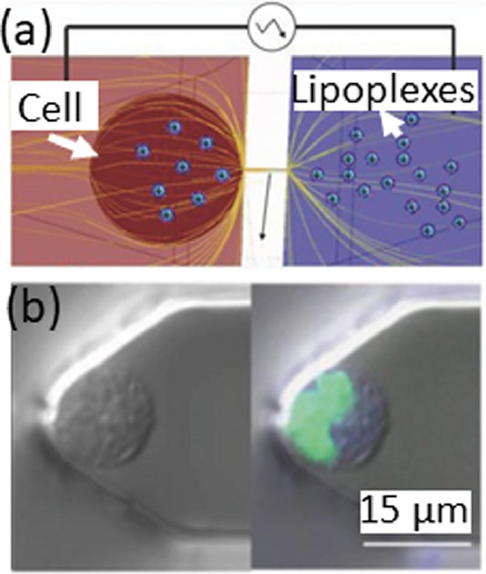 | Fig. 4. Delivery technology for single cell using nanofluidics. (a) Schematic of nanochannel electroporation (NEP) method for the injection of lipoplex nanoparticles into cell. (b) Confocalmicroscopy images for the confirmation of lipoplex nanoparticles injection by NEP. Reproduced with permission [75]. Copyright 2014, Wiley-VCH. | |