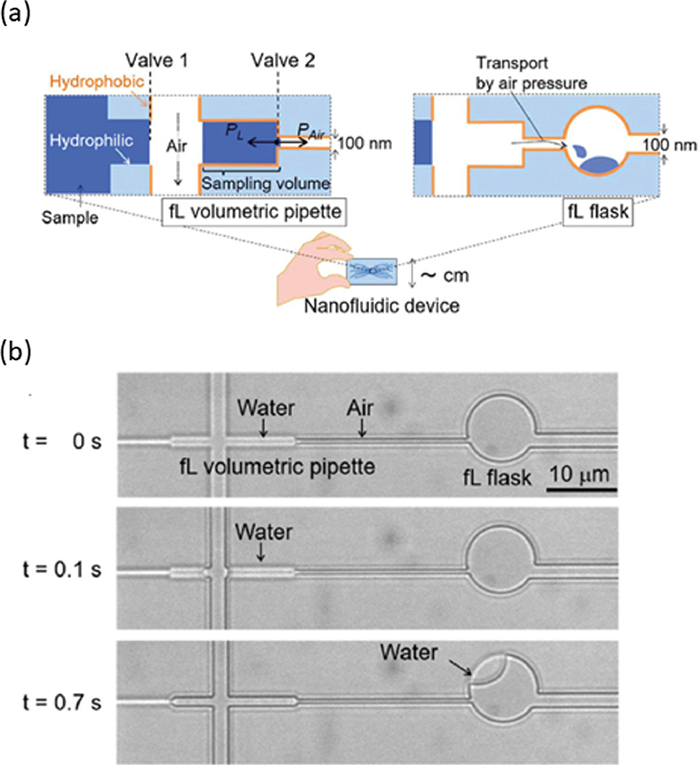 3.2. Sampling at sub-picoliter orderSampling of subcellular matter from a single cell is a challenge because the volume of the sample is extremely small, generally at sub-picoliter order. Simple nanochannels without additional functional structures or components are difficult to handle such small sample. Nakao et al. developed and integrated a femtoliter volumetric pipette and flask into a nanofluidic device to bridge this gap [93]. By utilizing surface tension and air pressure control, a well-designed nanochannel consisting of an 11 fL volumetric pipette and a 50 fL flask successfully generated and transported femtoliter-scale droplets after a series of processes (Fig. 5a). As shown in the optical microscopic images in Fig. 5b, water was first filled in the fL volumetric pipette channel controlled by surface tension. Thereafter, air pressures from the vertical channel and channel outlet were applied precisely to cut and form an fL droplet. Finally, the fL droplet in the pipette channel was transported into the fL flask via the removal of air pressure from the channel outlet. Such capabilities well meet the requirement of sub-single cellular study. Hence, the technology is very promising for handling subcellular matter from a single cell in the future.