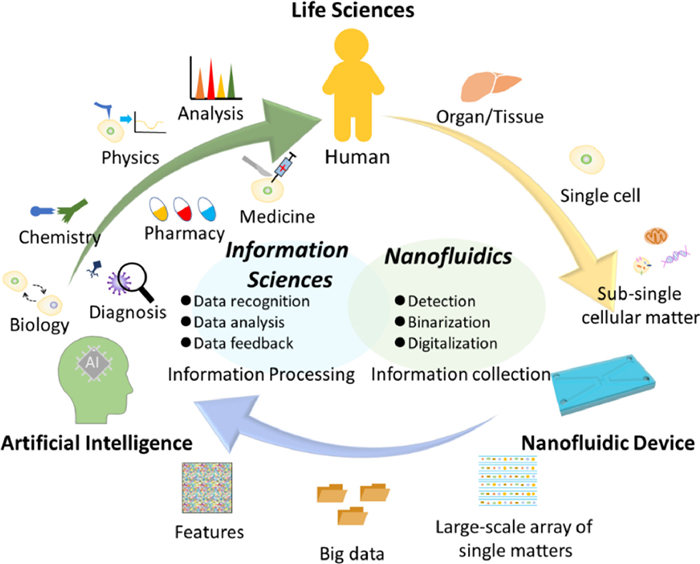 Information sciences are a discipline on obtaining, managing, analyzing, and utilizing data from large-scale, complicated data by using tools such as supercomputers, big data, and artificial intelligence (AI). In the conceptual workflow shown in Fig. 7, nanofluidics, which is good at handling and detecting subcellular matter, serves as "information collector." Thereafter, sub-single cellular matters from a single cell are captured and arrayed at the single matter level. While the detected signal at the place of the array where a single matter exists can be expressed as "1", the place of the array where no matter is detected can be expressed as "0". Thereby, the number of a certain kind of subcellular matter can be converted to a digital data through the binarization. Such number is one of most basic and important quantities to describe the specific features of the single cell and should varies between cells in both static and dynamic conditions at certain spatiotemporal resolution, revealing the intrinsic nature of the heterogeneity between individual cells. The digitalization of such number will be indispensably necessary because to fully understand the heterogeneity, numbers of many kinds of molecules and subcellular matters from many cells will form large-scale data. While conventional data analytical methods are no longer effective for such large-scale data, tools such as super computers and big data will be applied. Hence, the digitalization of the basic quantities of subcellular molecules and matters through nanofluidics will be an ideal solution to sub-single cellular studies. The as-obtained big data will represent a variety of features containing a large amount of single cell feature information, which can be further processed, recognized, and analyzed using AI. As "data feedback, " information reflecting the biological origin could permit much deeper insight into the organism, or even a human level. Therefore, the use of nanofluidics will not only accelerate sub-single cellular studies but also contribute the fusion of life sciences and information sciences. Such fusion could revolutionize not only cell research but also many related areas, including basic sciences such as biology, chemistry, and physics, and as well as applied sciences such as diagnosis, medicine, and drug discovery. The fusion will significantly deepen our understanding of biology at multiple levels ranging from molecular, to cellular, organismal and human levels, and finally, contribute to the health and welfare of our human beings.