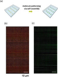 | Fig. 6. Promising high-throughput arraying technology for sub-single cellular matter. (a) Schematic of molecule patterning on the gold nanoarray via self-assembly. (b) Bright field image of gold nanoarray in nanochannels before molecule patterning. (c) Fluorescence image of nanoarrays with immobilized molecules. Reproduced with permission [92]. Copyright 2015, the Royal Society of Chemistry. | |