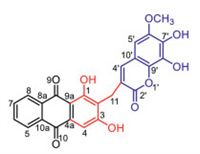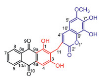 Natural anthraquinones comprise an important class of secondary metabolites with a 9, 10-anthracenedione core derived from polyketides or chorismate/o-succinylbenzoic acid [1, 2], and show a range of biological activities such as anticancer, laxative, anti-inflammatory, antibacterial, and hypoglycemic activities [3-5]. Their structural diversity mainly originates from biological oxidation and glycosylation of the benzene rings, and homodimerization of monomeric subunits [3]. Fewer anthraquinone derivatives are characterized by anthraquinone-xanthone heterodimers [6-8], and anthraquinone-based antibiotics [9-13]. Natural coumarins are a large group of heterocyclic compounds exhibiting versatile bioactivities, and most of them represent 7-hydroxycoumarin derivatives with various substitutions and conjugations, as well as regioisomeric dimers [14]. The benzo-α-pyrone motif of coumarin has also been demonstrated to be a unique pharmacophore in medicinal chemistry [15, 16].