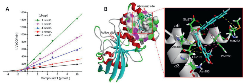 | Fig. 4. (A) Dixon plot for PTP1B showing 1/V versus varying concentrations of 1 at pNpp concentrations of 1, 2, 4, 8, and 16 mmol/L. (B) 3D molecular docking model of compound 1 in the allosteric site of PTP1B (PDB code: 1T49). The key hydrogenbonds with Asn193 and Glu276, π-π stacks with Phe280, and π-alkyl interactions with Leu192, Ala189, and Met282 are shown with green, pink, and yellow dashed lines, respectively. | |